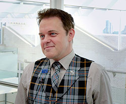Headshot of Dr Munro Stewart wearing glasses and blue suit